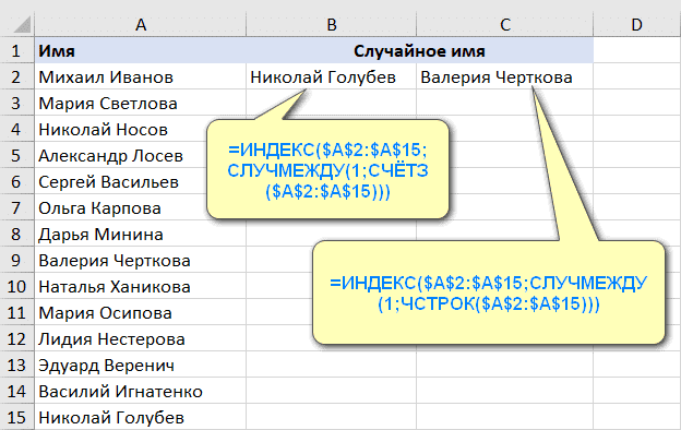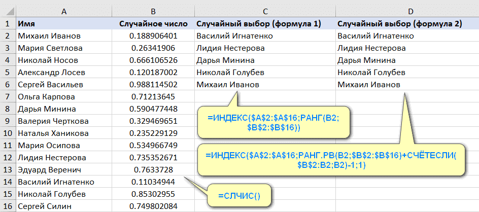 Конечно, эти формулы могут не только выбирать случайные имена, но и случайные числа, даты или любые другие данные из ячеек.