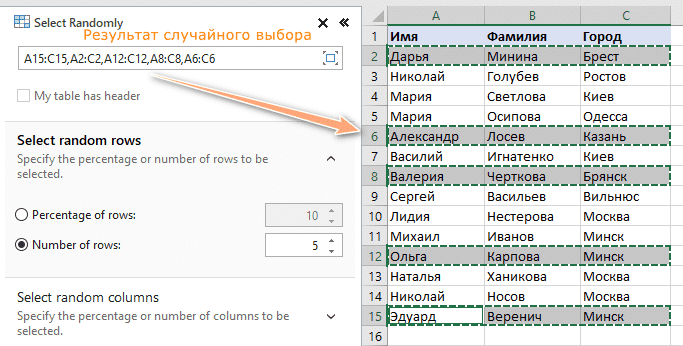Давайте рассмотрим несколько быстрых способов случайного выбора имен, чисел или других данных. Вы также узнаете, как получить случайную выборку без дубликатов и как случайным образом выбрать указанное число или указанный процент ячеек, строк или столбцов.