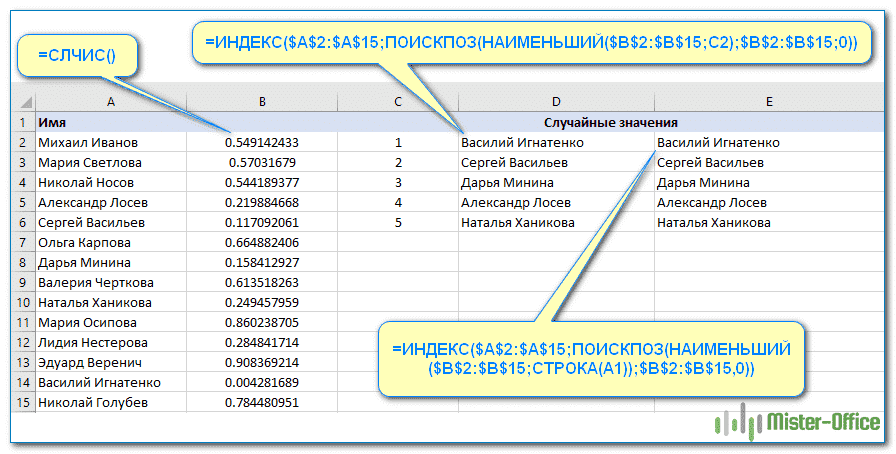 Объясняем, как это работает. Используя функцию НАИМЕНЬШИЙ (), выберите наименьшее значение из сгенерированных чисел. Функция ПОИСКПОЗ помогает нам определить его позицию в списке. А затем, используя INDEX (), получите имя в этом месте.