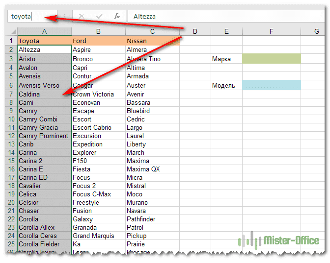 Итак, мы получили 3 названных линейки: «Тойота», «Форд», «Ниссан». Сделать их статическими (фиксированными) или динамическими (сбрасываются автоматически) — решаете сами. Для получения информации о том, как создать список автозаполнения, перейдите по ссылке в конце этой статьи.