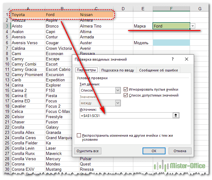 Итак, в этом примере возьмем текстовые значения из A1: C1, выберите одно. Например, «Форд». Поскольку у нас одно и то же имя для одного из именованных диапазонов, мы используем INDIRECT для преобразования текста «Ford» в ссылку = ford. И теперь мы используем его как источник для связанного выпадающего списка.