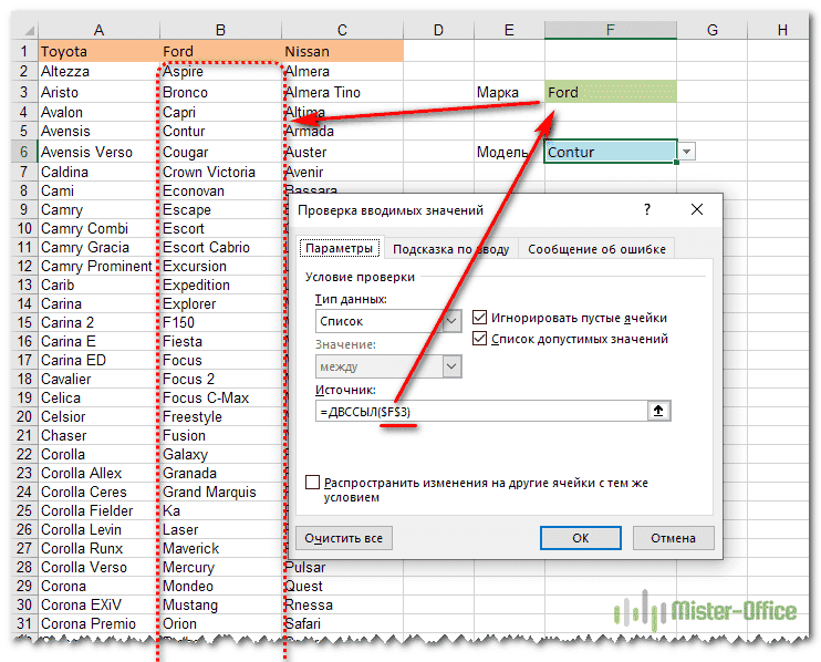 В D2 создайте раскрывающийся список, используя это выражение. В нем будут представлены только модели Ford, поскольку этот бренд был выбран ранее.