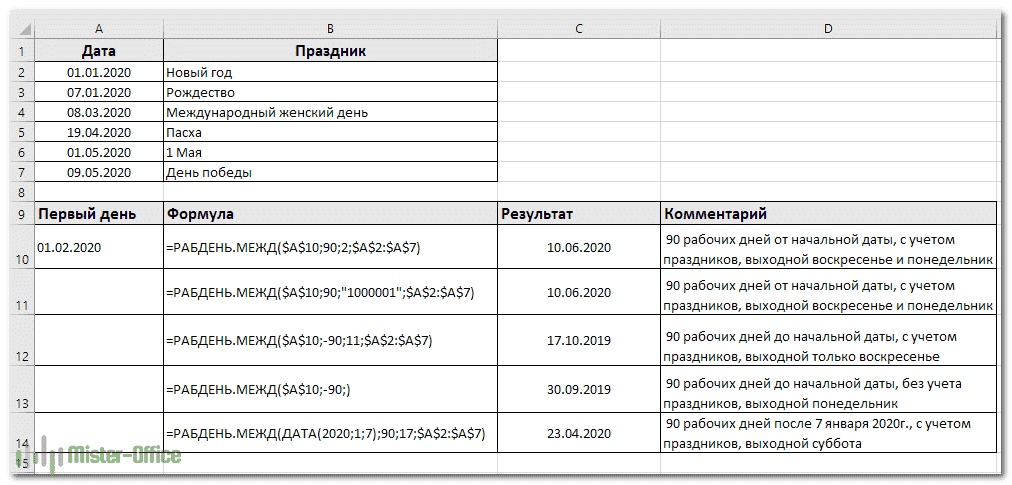 Предположим, у нас есть начальная точка времени в ячейке A10 и список праздников в ячейках A2: A7. Вы хотите знать, какая дата будет 90 рабочими днями в будущем и в прошлом.