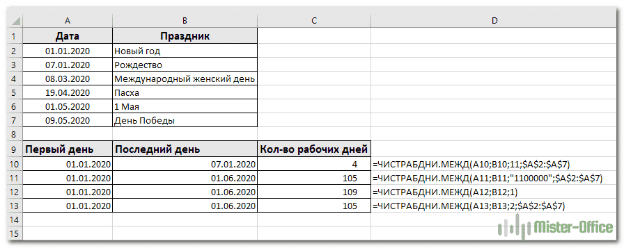 - Праздники — это необязательный список дат, которые считаются нерабочими днями. Это может быть диапазон ячеек, содержащий даты, которые вы хотите исключить из вычислений, или константу массива.