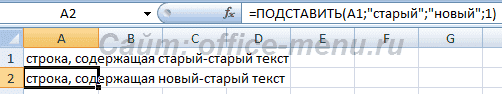 Строка в ячейке A1 содержит текст, содержащий 2 подстроки типа «старый». Нам нужно заменить строку «новый» на первое вхождение. В результате часть текста «.. старое-старое…» заменяется на «.. новое-старое…».