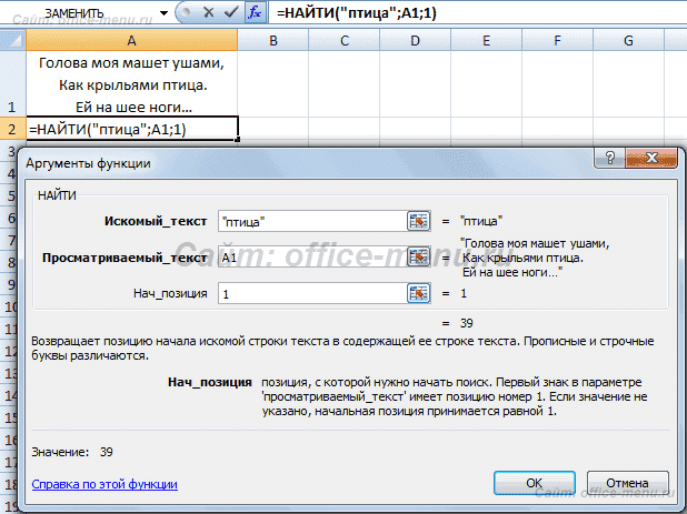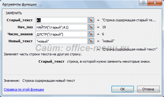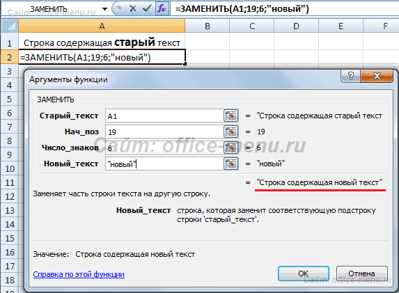 Здесь, в строке, содержащейся в ячейке A1, слово «старый», которое начинается с 19-го символа и состоит из 6 символов, заменяется словом «новый».
