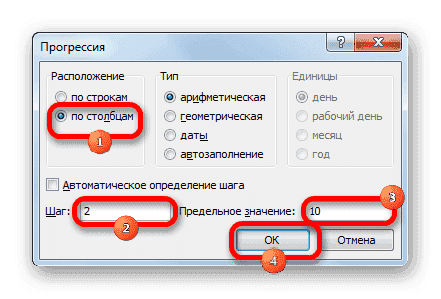 Откроется окно для установки прогрессии. В параметре «Позиция» установите переключатель в положение «По столбцам», так как в нашем случае значения аргументов будут располагаться именно в столбце, а не в строке. В поле «Шаг» введите значение 2. В поле «Предельное значение» введите число 10. Чтобы начать прогрессию, нажмите кнопку «ОК».