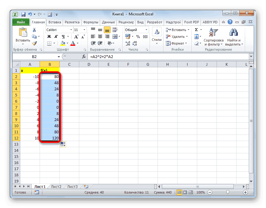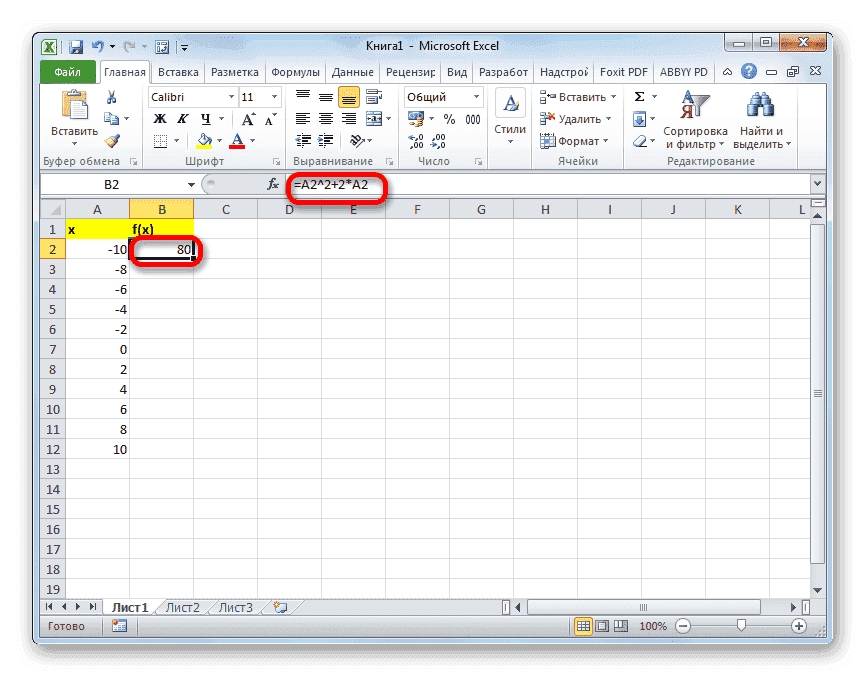 Теперь вам нужно заполнить столбец функции f (x) = x ^ 2 + 2x. Для этого в первой ячейке соответствующего столбца запишите выражение по следующему шаблону: