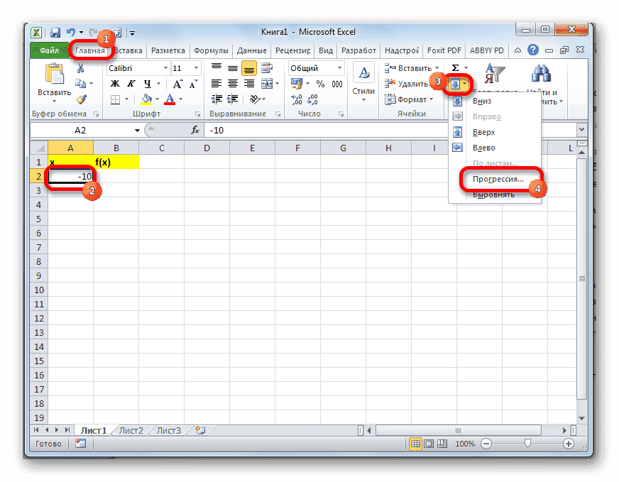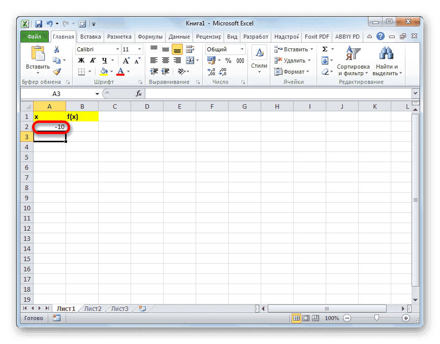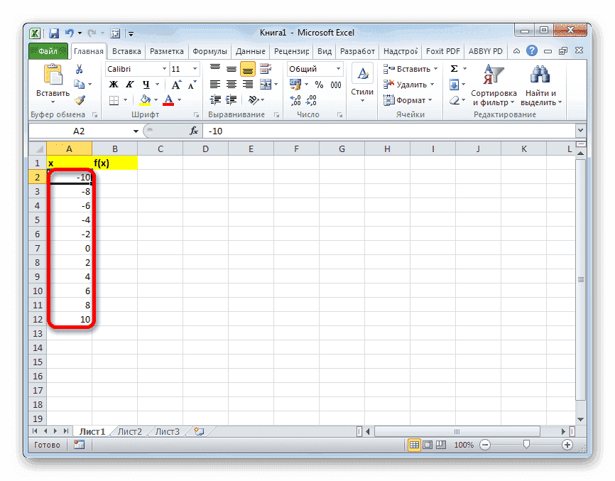 - В первой ячейке столбца «x» введите значение «-10». Сразу после этого нажмите кнопку Enter. Это очень важно, потому что если вы попытаетесь манипулировать мышью, значение в ячейке превратится в формулу, и в этом случае в этом нет необходимости.