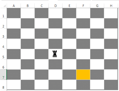 Давайте посмотрим на перемещение Башни на примере в Excel. Мы хотим начать с ячейки D5 (где находится башня), а затем спуститься на две строки и два столбца вправо и извлечь значение из ячейки. Для этого воспользуемся формулой: