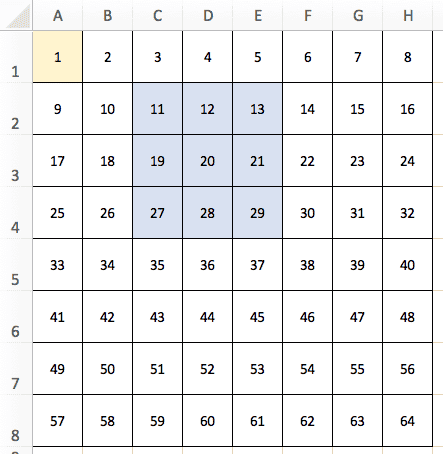 Точно так же формула = OFFSET (A1; 1; 2; 8; 3) (выделена синим) перемещает ячейку A1 вниз на 1, 2 вправо, мы получаем диапазон C2 и расширяем его до размера 8 для 3, например, соответственно, мы получаем ссылку C2: E9.