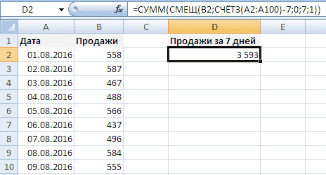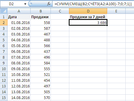 Из полученного результата вычитаем 7, чтобы найти первую дату искомого диапазона, затем, перемещая начальную ячейку (B2) на найденное значение и расширяя диапазон до размеров 7 на 1, мы получим данные последних 7 дней.