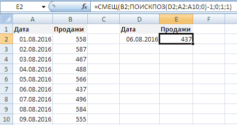 Мы используем функцию ПОИСКПОЗ, чтобы найти указанную дату (ячейка D2) в диапазоне дат (A2: A10).