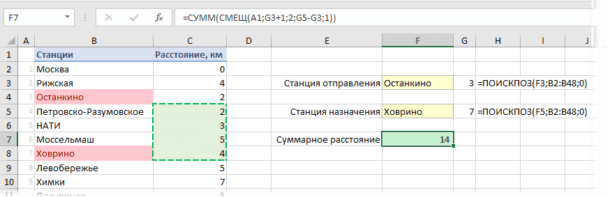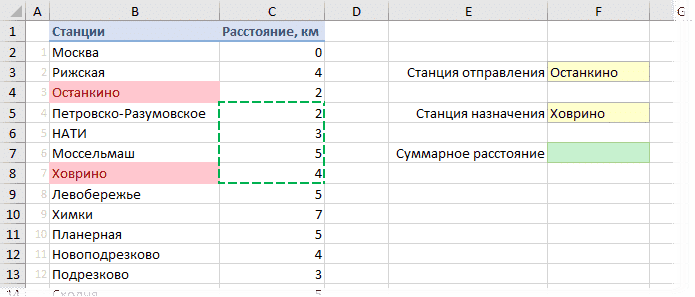 В выпадающих списках в желтых ячейках F3 и F5 пользователь выбирает станции отправления и назначения, а в зеленой ячейке F7 должна быть вычислена сумма всех ячеек в «окне», указанном на листе. Чтобы проехать от Останкино до Ховрино, как, например, на рисунке, вам нужно будет просуммировать все ячейки диапазона, обведенные зеленым.
