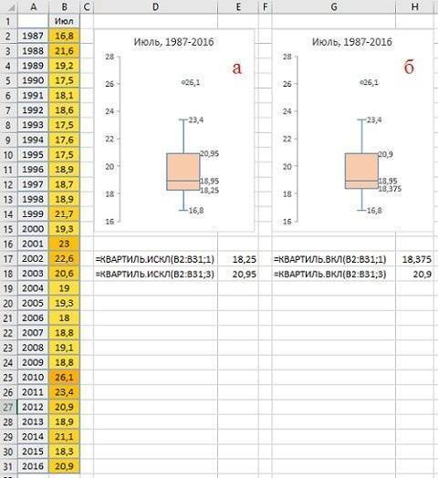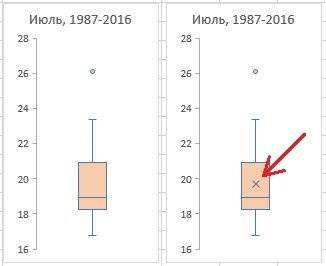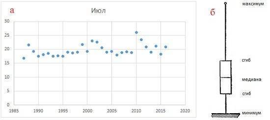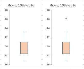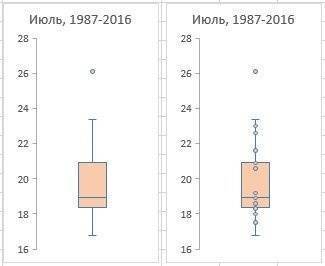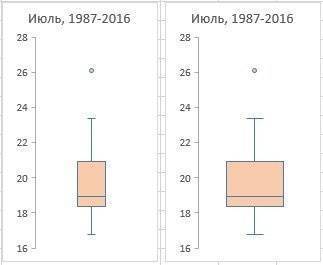 На основе данных о средних температурах июля за последние 30 лет (рис. 2) построим диаграмму «ящик-ус).