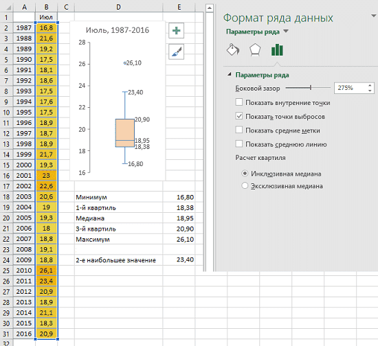 Диаграмма ящик с усами в Excel 2016