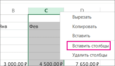 Чтобы вставить новый столбец, сделайте следующее: Щелкните правой кнопкой мыши весь столбец справа от того места, где вы хотите добавить новый столбец. Например, чтобы вставить столбец между столбцами B и C, щелкните столбец C правой кнопкой мыши и выберите «Вставить столбцы».