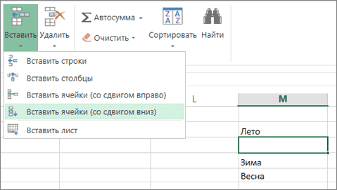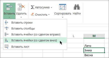 На вкладке «Главная» щелкните стрелку под кнопкой «Вставить», затем выберите «Вставить ячейки (сдвиг вниз).