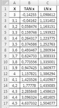 u в первом столбце таблицы (A2: A17) поместите значения X от 3 до 4,5 с шагом 0,1 (используйте технику автозаполнения — введите первое и второе значения и заполните строку);