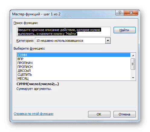 - Откроется окно мастера, в котором пользователь может выбрать любую функцию Excel, которую он сочтет полезной. Результат его обработки будет занесен в соответствующую ячейку строки «Итого».