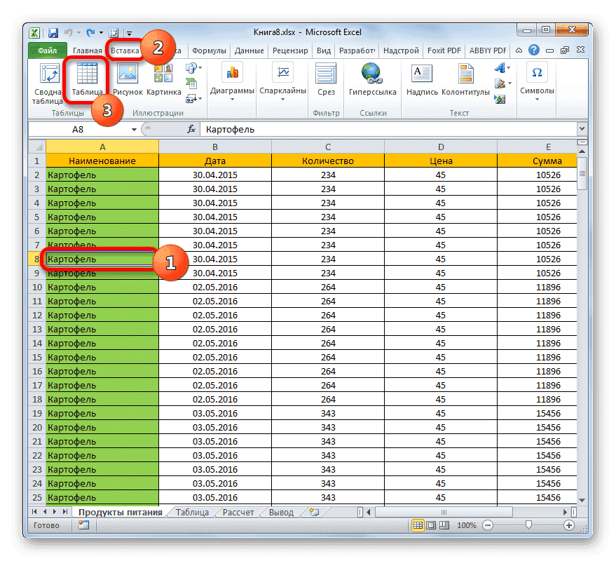 Есть еще один вариант форматирования. Точно так же мы выбираем весь или часть диапазона, который собираемся преобразовать в массив таблиц. Затем переключитесь на вкладку «Вставка» и на ленте на панели инструментов «Таблицы» щелкните большой значок «Таблица». Только в этом случае выбор стиля не предусмотрен и будет установлен по умолчанию.