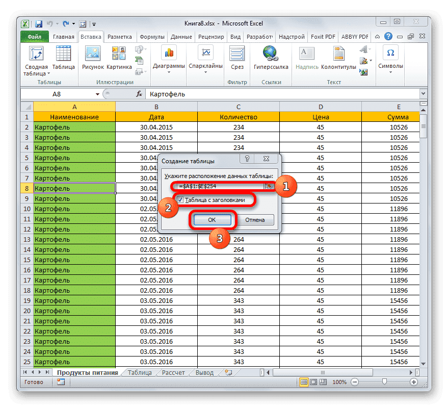 Также не забудьте установить флажок рядом с таблицей с заголовками, так как в большинстве случаев исходный набор данных уже имеет заголовки. Убедившись, что все параметры введены правильно, нажмите кнопку «ОК».