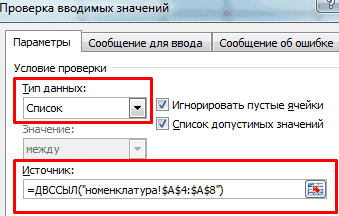 В поле «Тип данных» выберите «Список». Сразу отображается дополнительное поле «Источник». Чтобы получить значения для раскрывающегося списка с другого листа, используйте функцию: = ДВССЫЛ («item! $ A $ 4: $ A $ 8»).