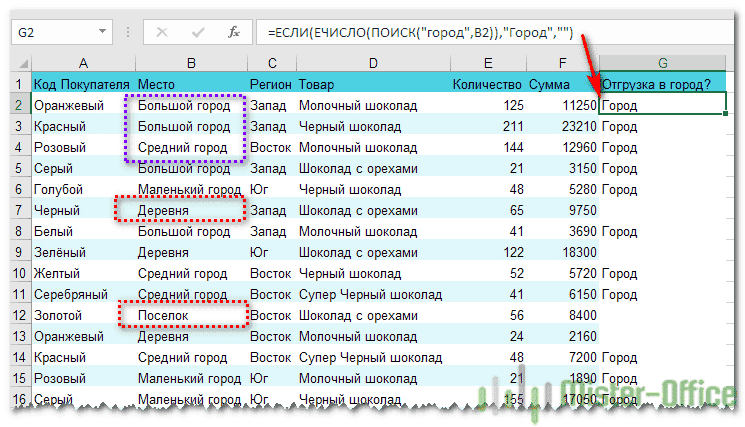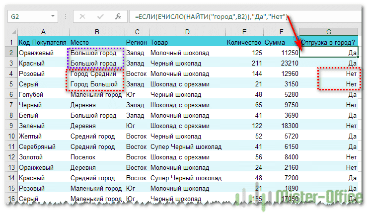 Выше мы видели, как использовать текстовые значения в функции ЕСЛИ. Но часто бывает, что необходимо определить не полное, а частичное совпадение текста с эталоном. Например, нас интересует город, но его название совершенно не важно.
