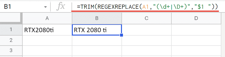 = ОБРЕЗАТЬ (REGEXREPLACE (A1; «(\ d + \ D +)»; «$ 1 «))