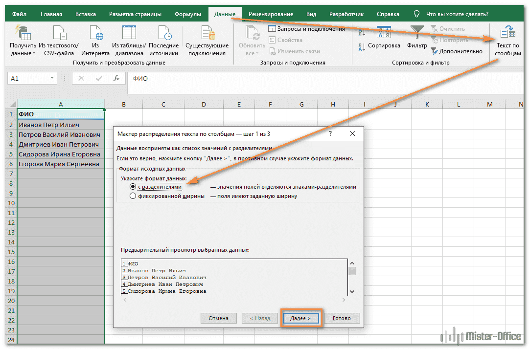 В столбце А нашей таблицы указаны фамилии, имена и отчества сотрудников. Вам нужно разделить их на 3 столбца.