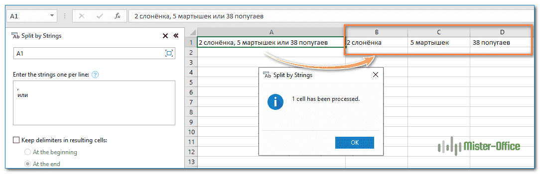 Поэтому мы разделили ячейку на 3 столбца, исключая слова-разделители.