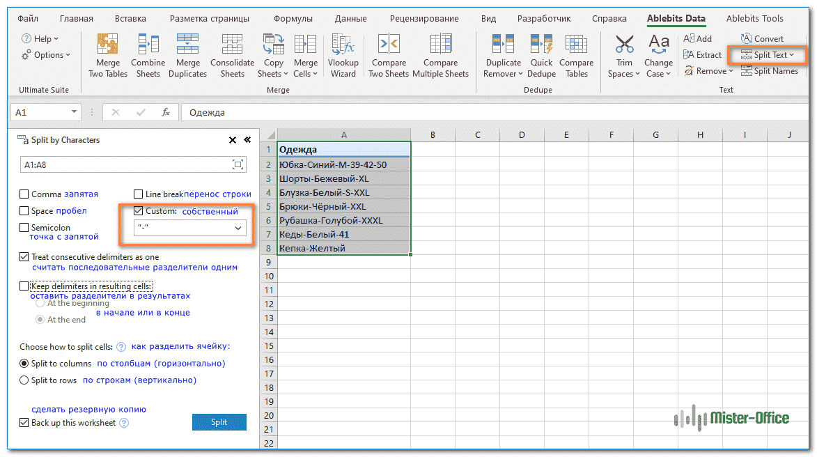 Альтернативный способ разбить столбец в Excel — использовать функцию разделения текста, включенную в надстройку Ultimate Suite для Excel. Он предоставляет следующие возможности: