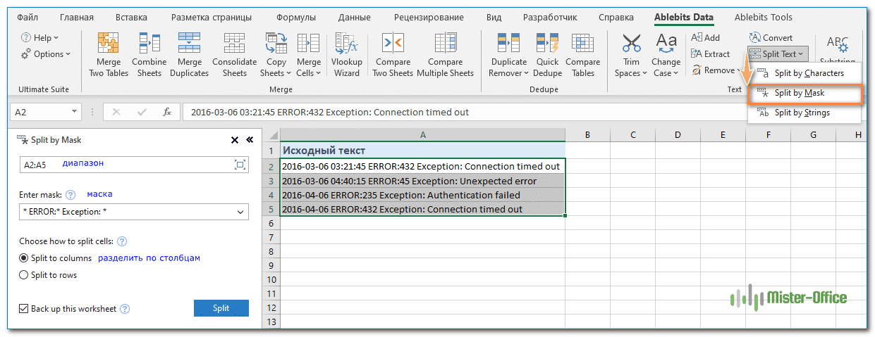 Примечание. При разделении строки по маске учитывается регистр. Поэтому не забудьте вставить символы в шаблон точно так, как они отображаются в исходных данных.
