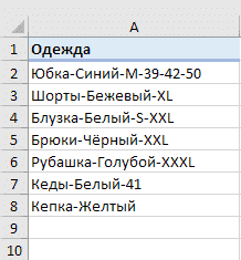 У нас есть список предметов одежды с различными атрибутами, перечисленных с тире. Как видите, у нас может быть от 2 до 6. Мы разделяем текст в наших ячейках на 6 столбцов, чтобы дополнительные столбцы в отдельных строках оставались пустыми.