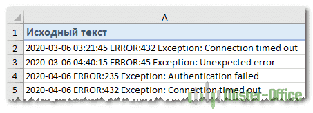 Предположим, у нас есть список строк, извлеченных из файла журнала. Ранее в этой статье мы разбили этот текст на ячейки с помощью формул. А теперь используем специальный инструмент. И вы сами решаете, какой способ удобнее и проще.