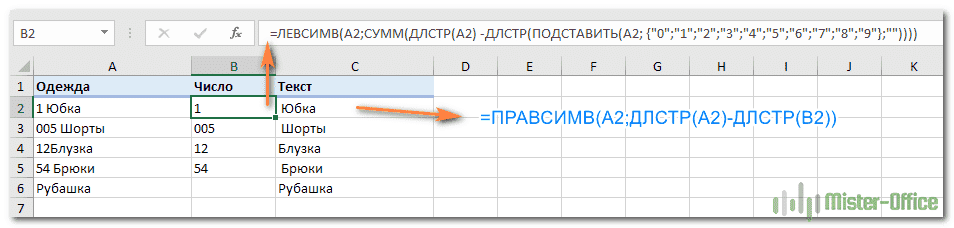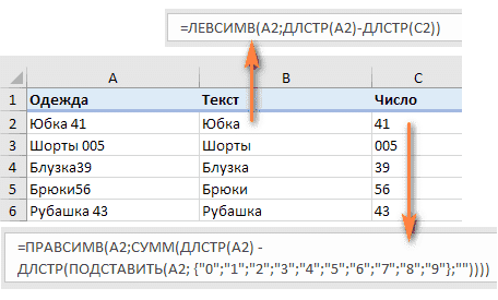 = ПРАВО (A2; СУММ (DLSTR (A2) -LSTR (ПОДСТАВИТЬ (A2; {«0»; «1»; «2»; «3»; «4»; «5»; «6»; «7» ; «8»; «9»};»»))))