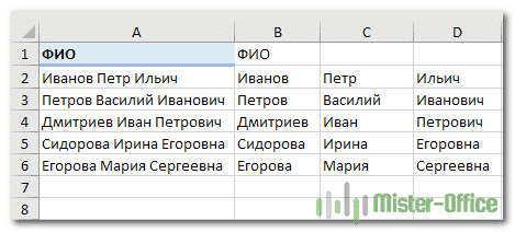 Вот результат нашей работы по разделению фамилии, имени и отчества из одной в отдельные ячейки.