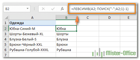 - Чтобы извлечь название продукта (все символы до первого тире), вставьте следующее выражение в B2, а затем скопируйте его в столбец: