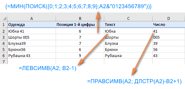 = ЛЕВЫЙ (A2; МИН (ПОИСК ({0; 1; 2; 3; 4; 5; 6; 7; 8; 9}; A2 & «0123456789»)) — 1)