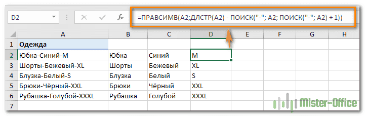 = ВПРАВО (A2; DLSTR (A2) — ПОИСК («»; A2; ПОИСК («»; A2) + 1))