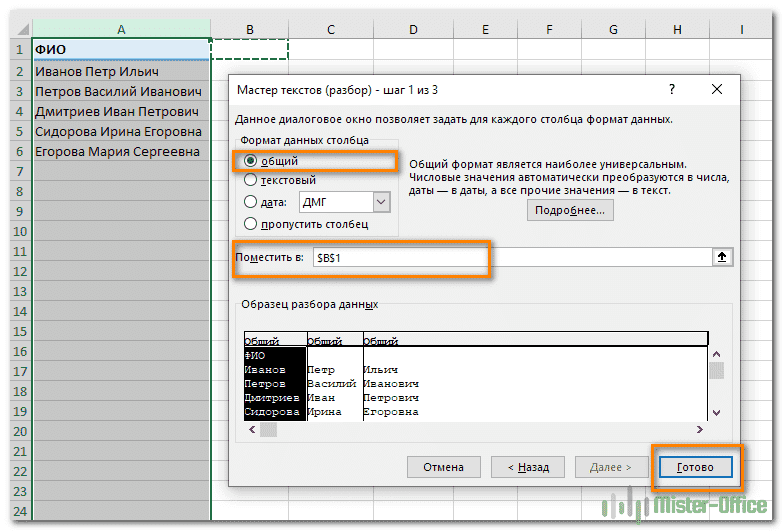 В следующем окне мы определяем формат данных. По умолчанию это будет «Общие». Подходит идеально, поэтому оставляем как есть. Выберите верхнюю левую ячейку диапазона, в котором будет размещен наш разделенный текст. Если вам нужно оставить исходные данные нетронутыми, лучше выбрать, например, B1.