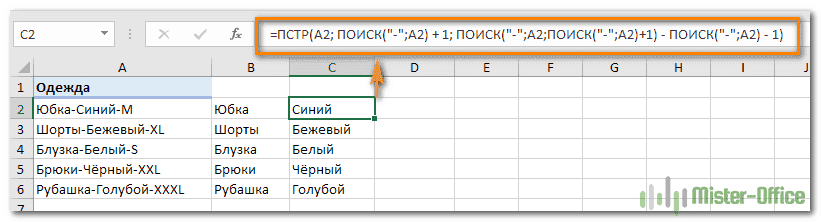 = MID (A2; ПОИСК («-«; A2) + 1, ПОИСК («-«, A2, ПОИСК («-«, A2) +1) — ПОИСК («-«, A2) — 1)