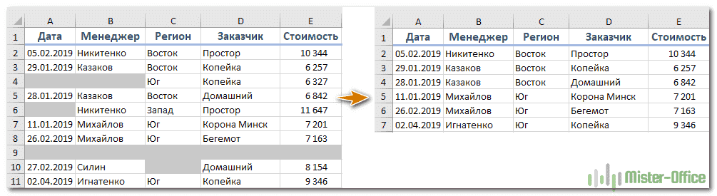 Удаление пустых ячеек в Microsoft Excel