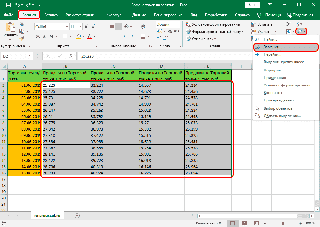 Замена точек на запятые в Excel разными методами