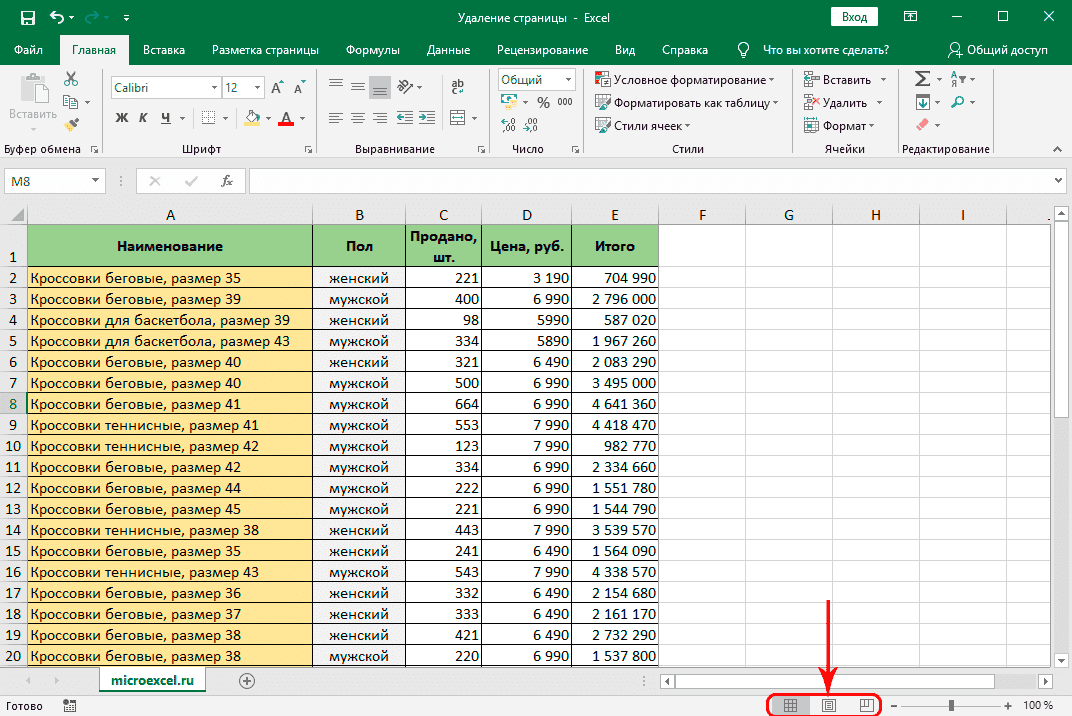 Удаление страницы в Excel