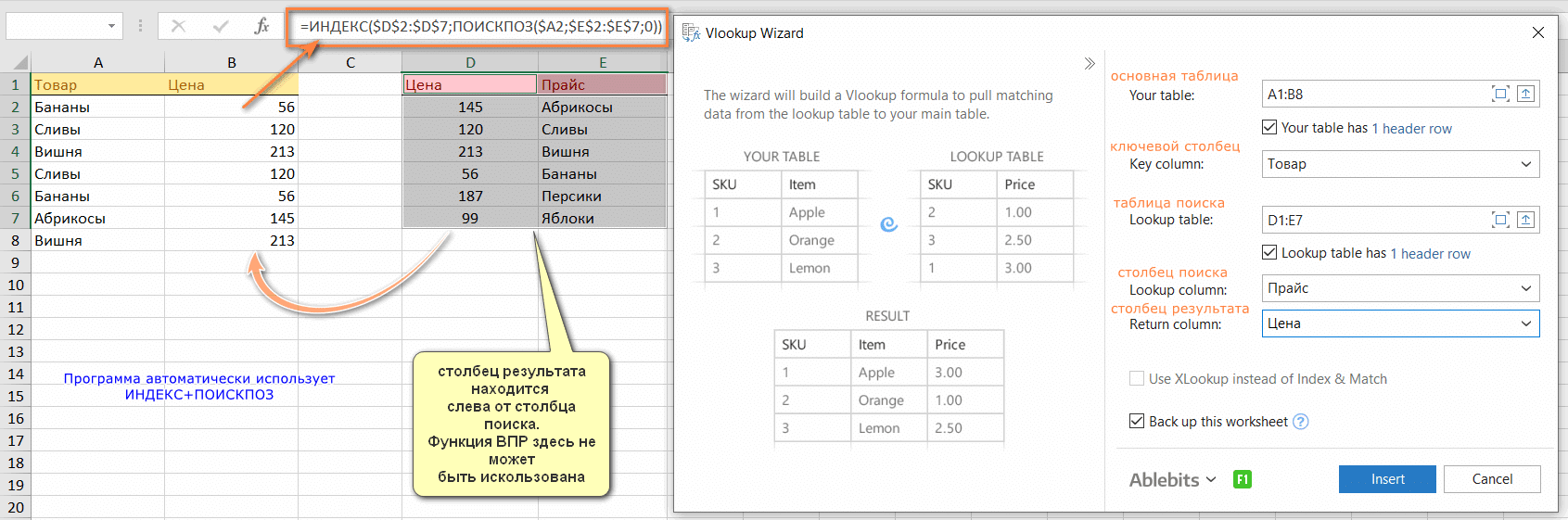 Когда столбец результатов (Цена) находится слева от области поиска (Цена), мастер автоматически вставляет формулу ИНДЕКС + ПОИСК: