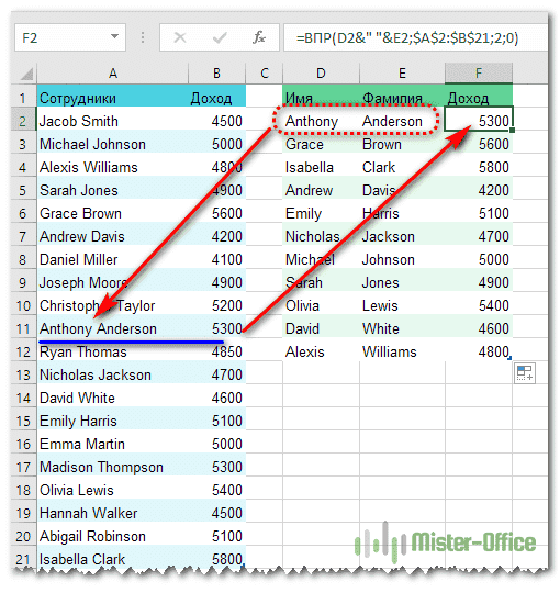 Затем в таблице доходов найдите ячейку с именем и фамилией, разделенными пробелом.