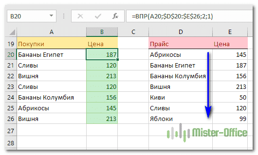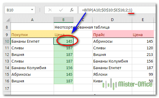 Как и в предыдущих примерах, наша задача — найти цену на каждый товар, извлекая ее из прайс-листа. Если область поиска (Цена) является крайним левым столбцом в области поиска, для точного совпадения вводится обычная формула ВПР: