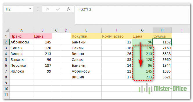 Наш прайс-лист находится в столбцах A и B. Список покупок находится в EH. Допустим, первый товар в списке покупок — это бананы. Нам нужно найти этот товар в столбце A, где указаны все названия, а затем ввести его цену в ячейку G2.