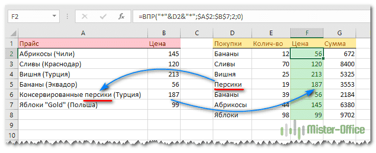 Конструкция «*» & D2 & «*» означает, что звездочки * добавляются к содержимому ячейки D2 с обеих сторон. То есть ищем любое вхождение этого слова — до и после него могут быть другие слова и символы. Как, например, случилось с продуктом «Персики». В нашем случае первый параметр будет иметь вид «* персики *». При поиске такого дизайна приемлемым вариантом будет «Консервированные персики (Турция)».